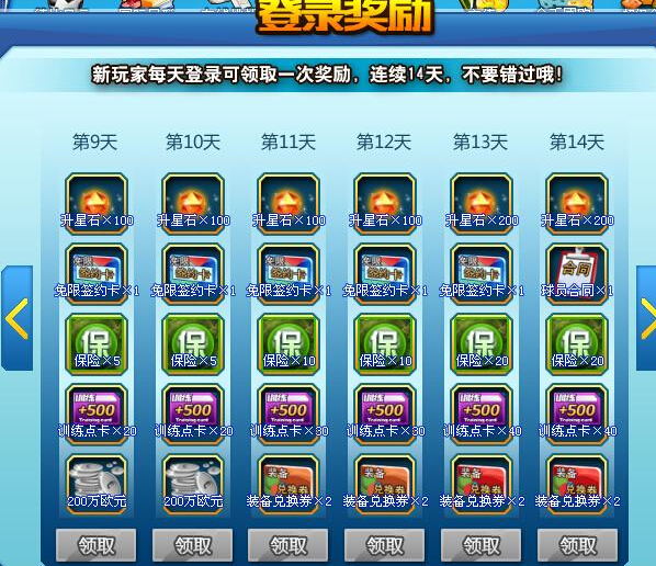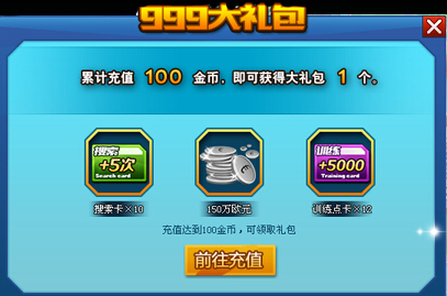 建立账号后,充值满100金币即可领取“999大礼包”一个!!内含搜索次数卡10张、150万欧元和12张训练点数卡。各位玩家可以通过点击游戏上方导航栏中的图标进行领取。