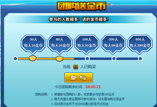 团购活动以“天”为计算周期,每天0点开始,直到24点结束。结束时,根据当天参与人数返还参与玩家金币,然后清零参与人数。
