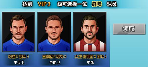 当玩家达到VIP3,即可免费领取巅峰球员一位!