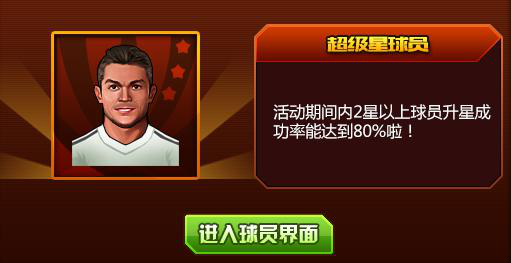 活动期间,玩家使用保险对球员进行升星,由原有的最高将成功率60%,调整为最高可提高成功率至80%!您可通过点击游戏上方进行活动页面,