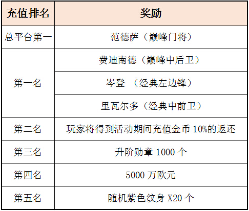 各位玩家在活动期间的充值会进行平台排名,充值前五名的玩家将得到额外奖励哦!