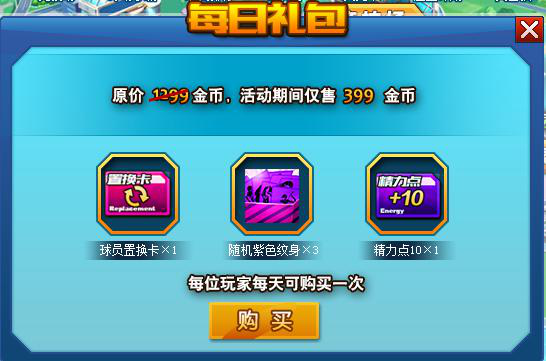 活动期间,玩家可在主界面点击购买“每日礼包”,礼包内含 球员置换卡1张、随机紫色纹身3张、精力点+10 1张。