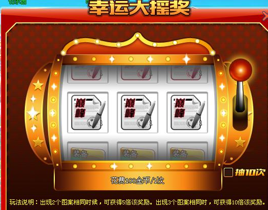 1、摇奖时摇出两个相同图案时,可以获得该道具的5倍奖励;出现3个相同图案时,可以获得该道具的10倍奖励!以上奖励发放到包裹。