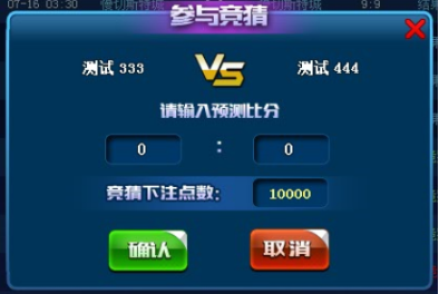 2、竞猜开始到截止时间,各位玩家可进行竞猜,竞猜为比分竞猜,需要输入准确的比分以及要下注的点数,点击确定完成操作,下注不可修改。