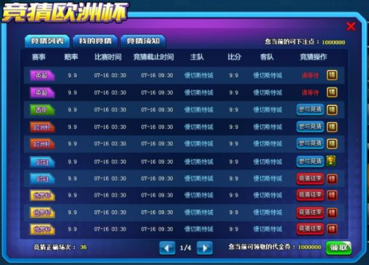 4、比赛结束后,会公布此场竞猜的比赛结果——竞猜成功,下注的投注点数按照界面显示的当场赔率,按照1:50代金券进行返还,返还的代金券可在活动界面领取,(代金券请在活动时间内领取,活动时间过后将清空之前积累的代金券);