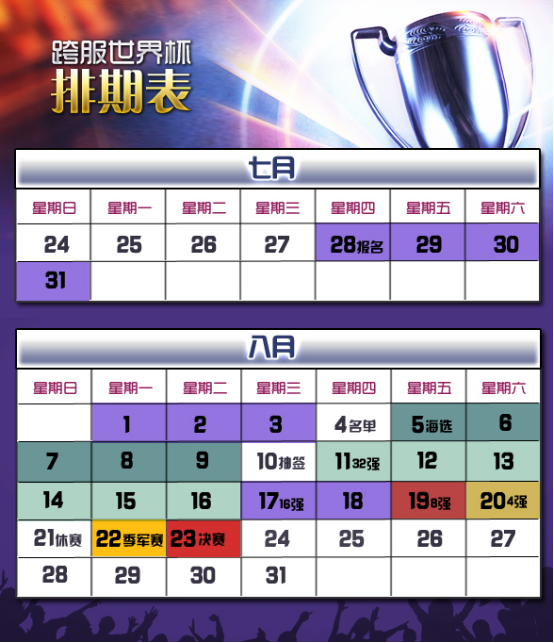 大家期待已久的跨服世界杯将于2016年7月28日正式启动!历时近一个月的激战过后,决赛将于2016年8月23日进行!