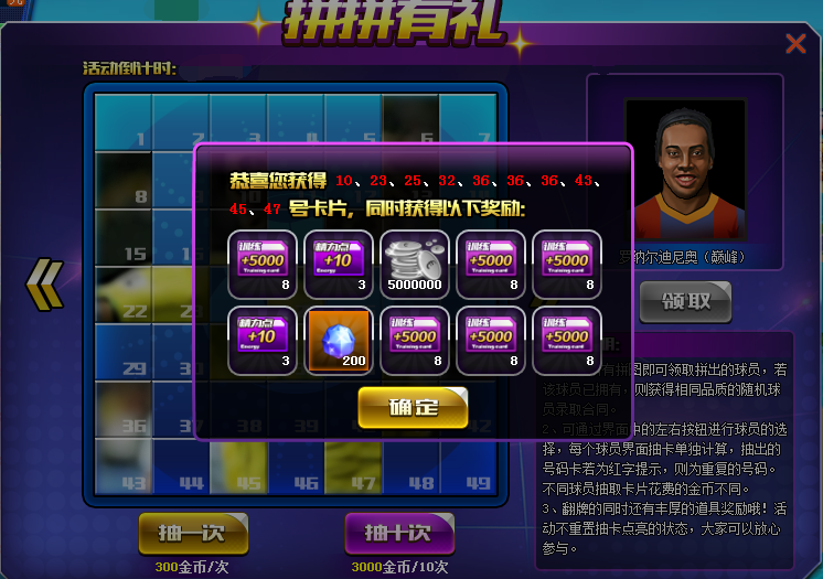 2、点亮所有拼图即可领取拼出的球员,若该球员您已经拥有,则获得相同品质的随机球员录取合同;
