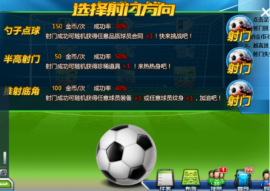 2、射门技能分为三个档次,每个档次花费的金币不同,获得的奖励也不同;