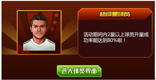 活动期间,玩家使用保险对球员进行升星,由原有的最高将成功率60%,调整为最高可提高成功率至80%!您可通过点击游戏上方进行活动页面,也可直接在球员列表中选择需要升星的球员参与活动