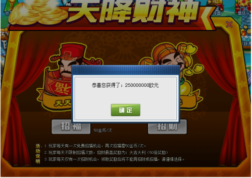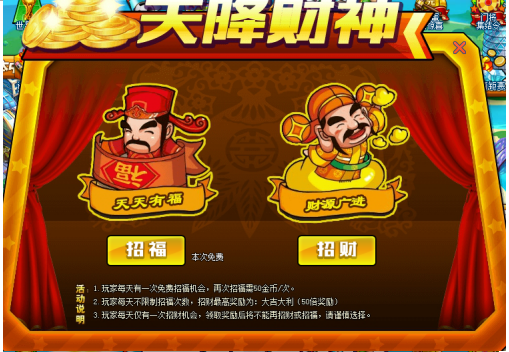 2.天降财神活动中共有福神与财神两位神仙,玩家需先点击福神进行招福,不同的福缘代表不同的奖励倍数,每天的首次招福免费,后续每次招福消耗50金币,单日招福不限制次数,直至达到最高福缘。玩家招福后可进行招财,招财奖励X招福倍数即为当日奖励。