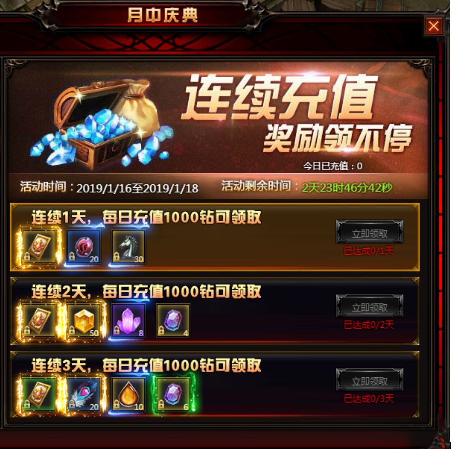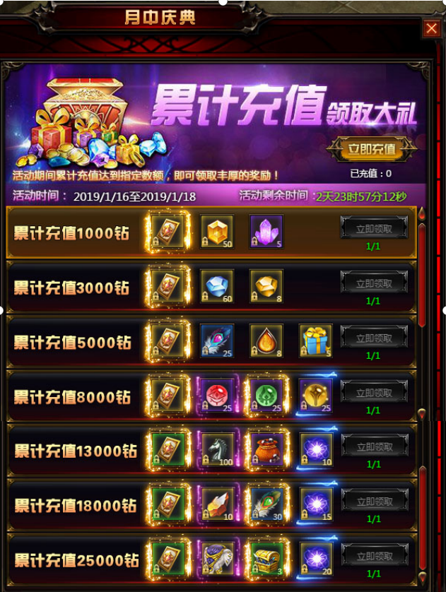 活动内容:玩家在活动时间内,累计充值达到一定钻石即可获得丰厚礼品,boss卡、大象坐骑幻化等你来拿!