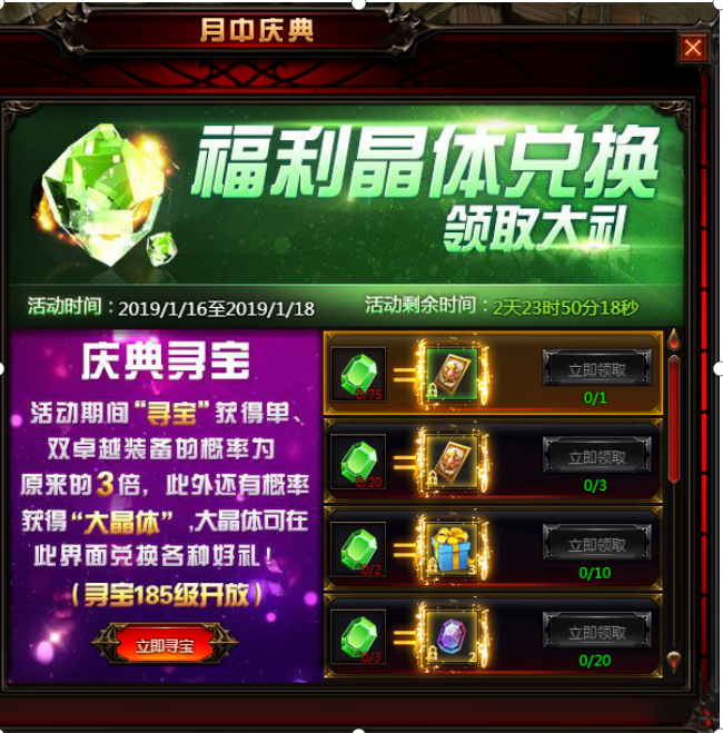 活动内容:在活动时间内,“寻宝”可获得单、双卓越装备的概率为原来的三倍,此外还有概率获得“大晶体”,大晶体可在月中庆典专属页面中兑换好礼,等你来拿!