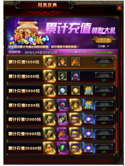 活动内容:玩家在活动时间内,累计充值达到一定钻石即可获得丰厚礼品,boss卡、紫色神灵随机箱等你来拿!