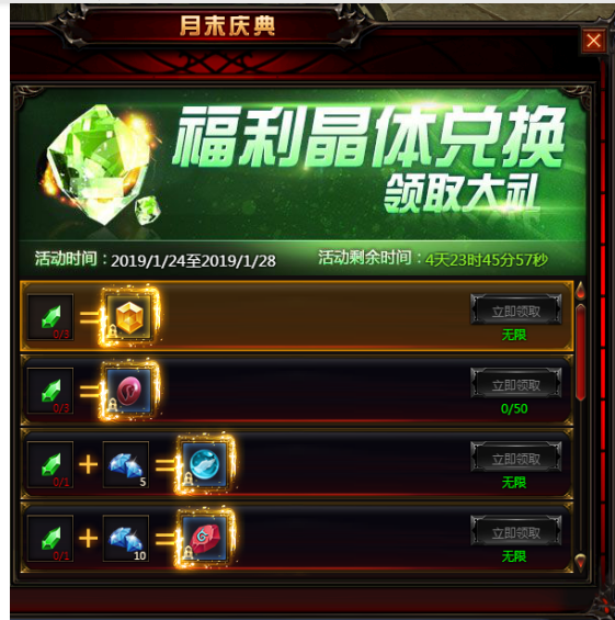 活动内容:玩家在日常挂机击杀小怪可获得小晶体,击杀野外BOSS、黄金BOSS、魔王BOSS(活动)都可获得中晶体,使用不同晶体及钻石比例可兑换游戏中稀有道具,详情请根据游戏中活动兑换页面为准。