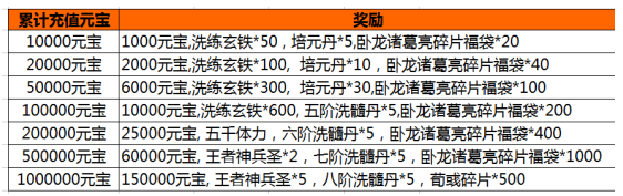 活动内容:活动期间,游戏内充值活动,玩家单笔充值一定金额,即可获得相应的充值奖励。(单笔充值奖励只计算充值元宝最大值,可以单笔重复充值重复领取)