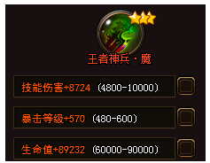 通关魔城挑战第七层后,可以将“王者神兵·涅”升级成“王者神兵·魔”,超级属性加成,生命值最高洗炼至90000,伤害防御可达到10000,暴击等级最高600,。可以同时洗炼三种不同的属性加成,玩家可以根据自身需求进行调整。