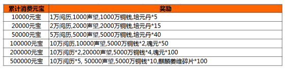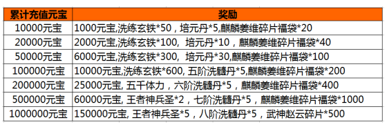 活动内容:活动期间,游戏内充值活动,玩家单笔充值一定金额,即可获得相应的充值奖励。(单笔充值奖励只计算充值元宝最大值,可以单笔重复充值重复领取)