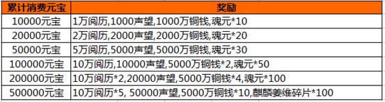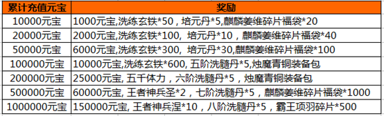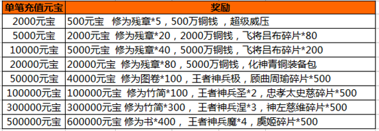 活动内容:活动期间,游戏内充值活动,玩家单笔充值一定金额,即可获得相应的充值奖励。(单笔充值奖励只计算充值元宝最大值,可以单笔重复充值重复领取)