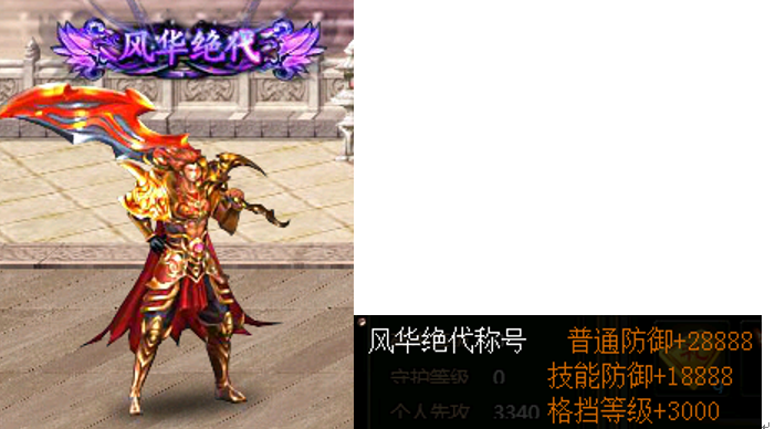 一:防御型酷炫称号,普通防御+28888.技能防御+18888.格挡等级+3000,为玩家一统三国保驾护航。并且与其他称号属性可以同时佩戴生效。