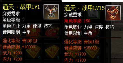 二:新增主角“通天战甲”,1级提升普通防御+10000,武力值+200,内力+200.每30级可以升级一次。最高加成初始加成普通防御+35000,武力+1700,内力+1700.并且可以装备可以强化提高属性。附带烛魔套装效果!征战必不可缺神甲!