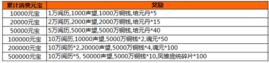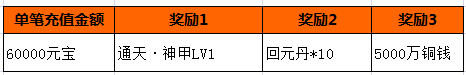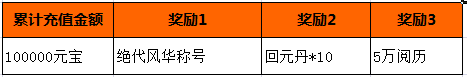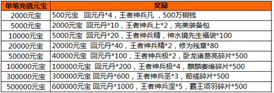 活动内容:活动期间,游戏内充值活动,玩家单笔充值一定金额,即可获得相应的充值奖励。(单笔充值奖励只计算充值元宝最大值,可以单笔重复充值重复领取)