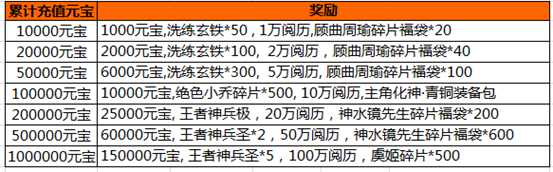 活动内容:活动期间,游戏内充值活动,玩家累计充值一定金额,即可获得相应的充值奖励。(单笔充值奖励只计算充值元宝最大值,可以单笔重复充值重复领取)