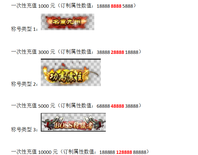1、玩家充值都将获得对应的称号,每次充值只能领取一个订制称号。