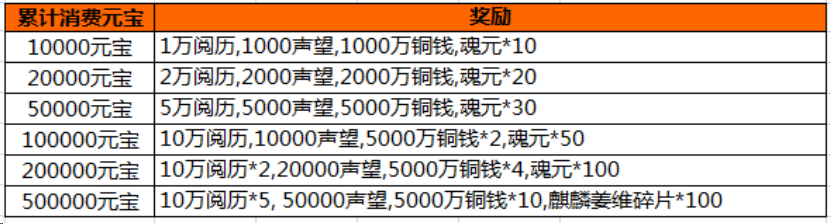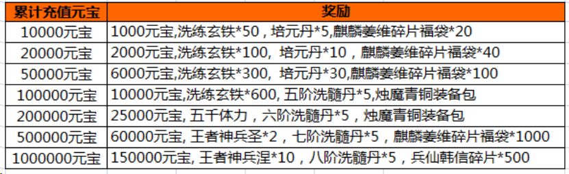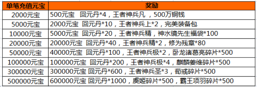 活动内容:活动期间,游戏内充值活动,玩家单笔充值一定金额,即可获得相应的充值奖励。(单笔充值奖励只计算充值元宝最大值,可以单笔重复充值重复领取)
