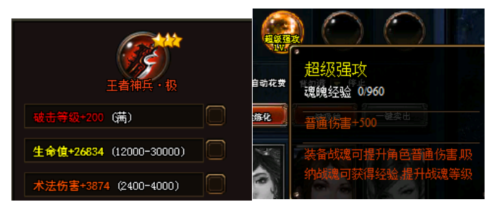 1、王者神兵神级道具,三种属性高数值加成,可洗练出玩家想要的属性,生命值最高洗练加成30000,伤害防御类最高加成4000,暴击、破击等级等最高加成200,随心加成。