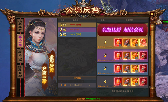 国庆期间玩家充值一定的金砖就可以进入全服排名,达到一定的排名即可以各种极品道具奖励!!!!