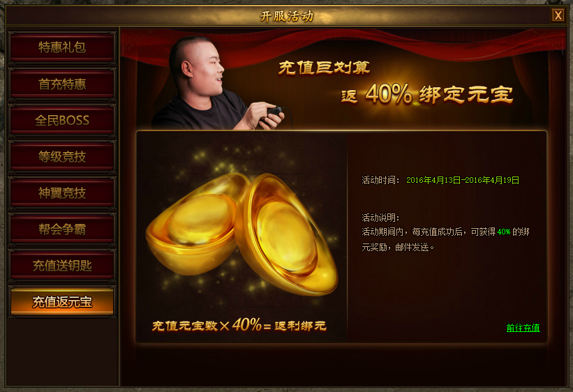 活动内容:活动期间内,玩家充值成功后,可获得充值元宝40%的绑元返利哦!