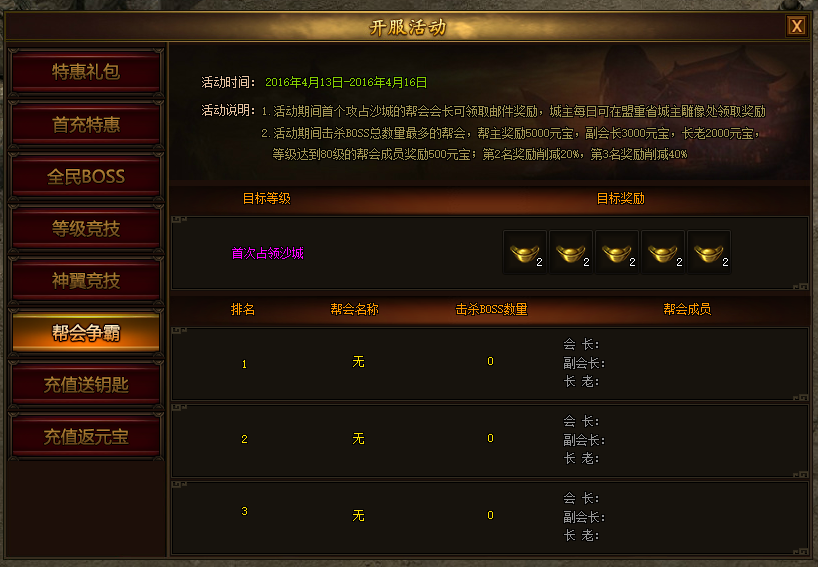 活动内容:开服第4天20点系统自动开启首次攻城战,成功占领沙巴克的帮会会长可以“玛法主宰者”称号,并获得10000元宝奖励;开服第1~4天内,击杀BOSS总数量排名前3的帮会可获得大量元宝奖励呦!