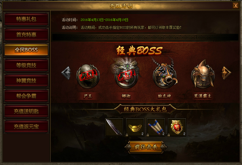 活动内容:活动期间内,玩家可通过击杀相应BOSS,领取高级装备与大量道具!