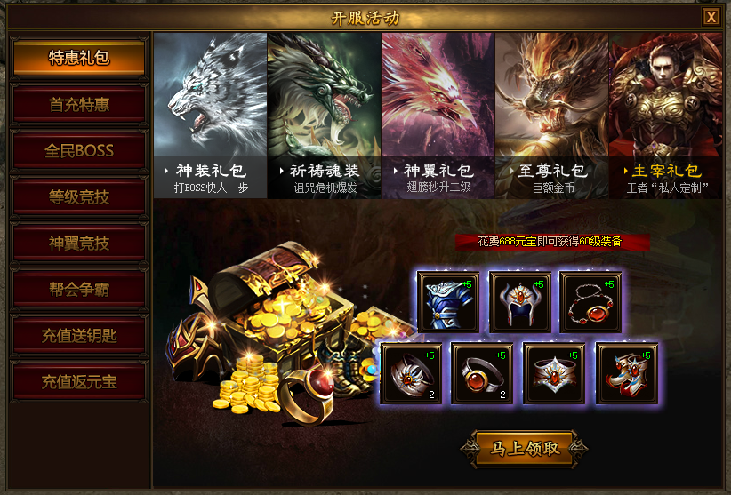 活动内容:活动期间内,玩家可花费元宝领取超值礼包,内含多种装备与道具,让你畅玩游戏,丝毫无忧!