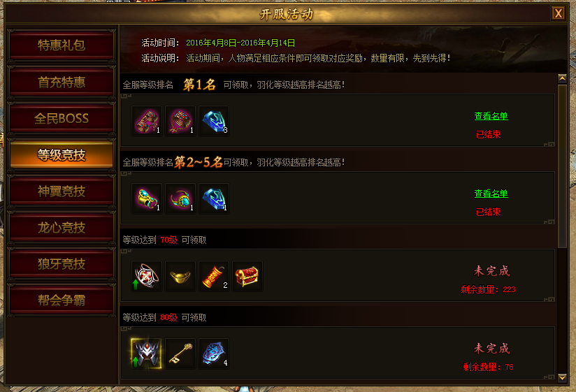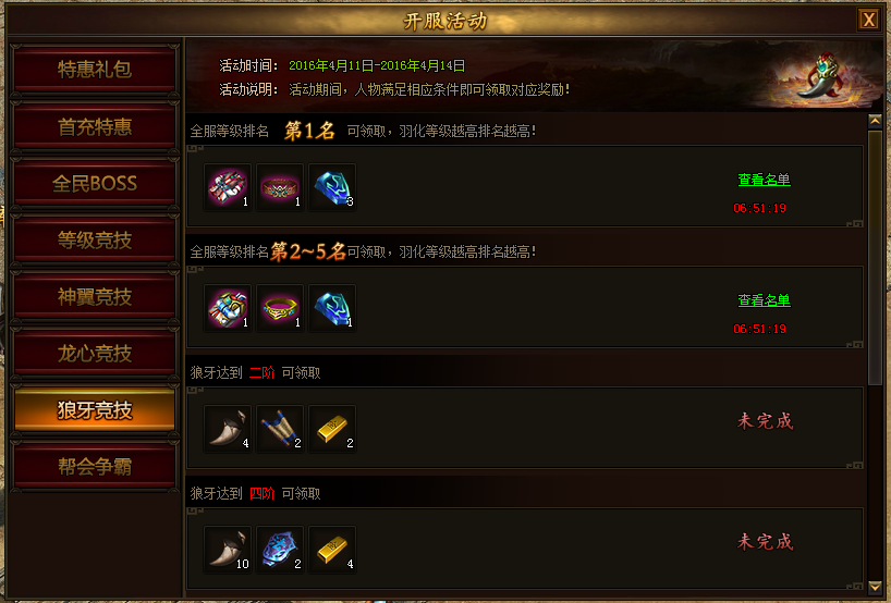 活动内容:活动期间内,玩家狼牙等级排名前5的玩家可活动相应奖励;玩家狼牙达到相应等级后,可领取相应奖励