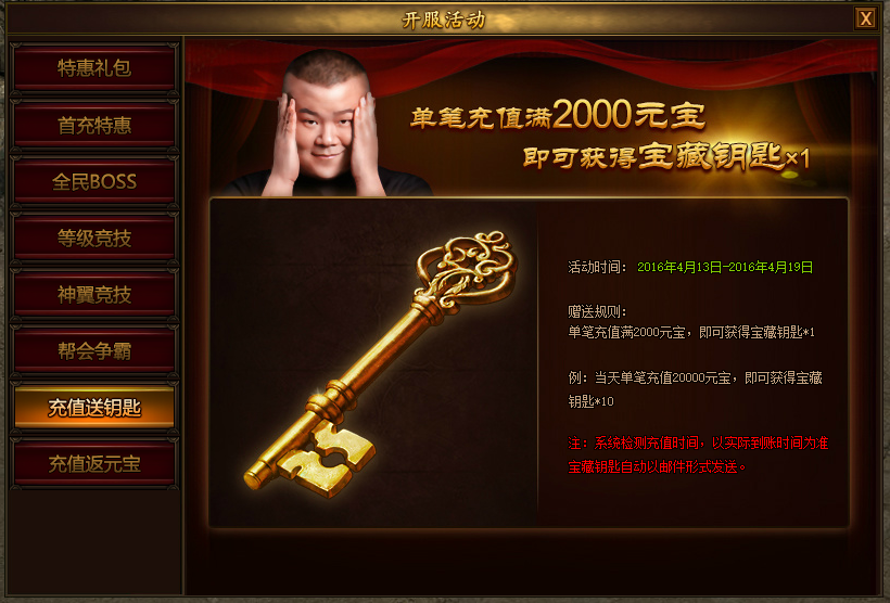 活动内容:活动期间内,玩家每单笔充值满2000元宝,即可获得宝藏钥匙*1