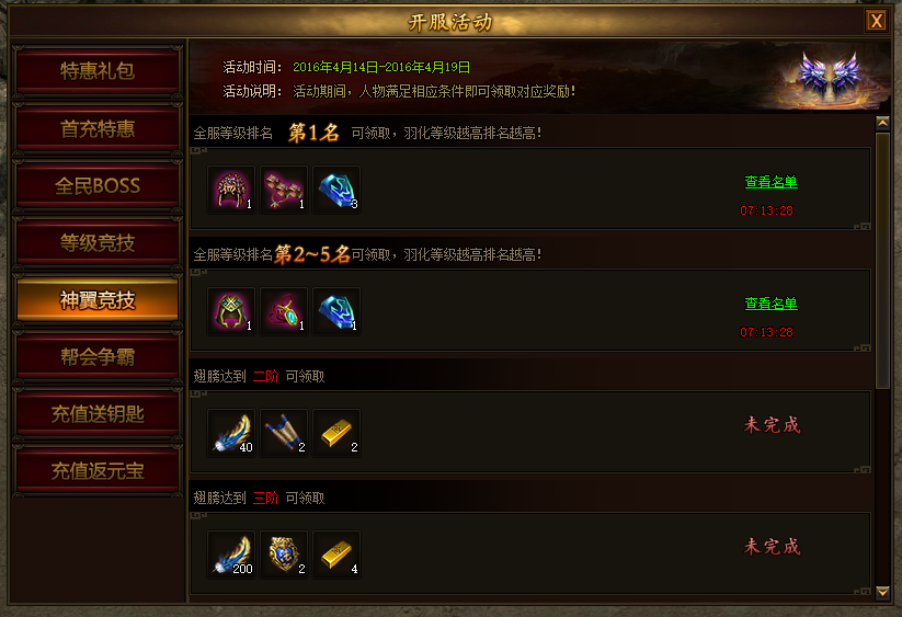活动内容:活动期间内,玩家翅膀等级排名前5的玩家可活动相应奖励;玩家翅膀达到相应等级后,可领取相应奖励