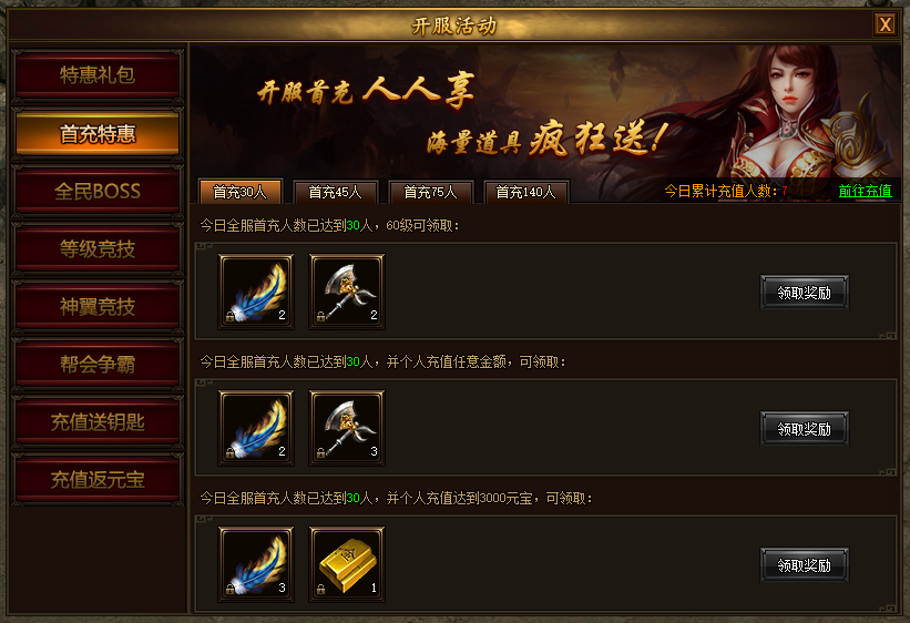 活动内容:单个服务器内,充值的玩家达到一定数量后,可根据相应条件领取丰厚奖励!