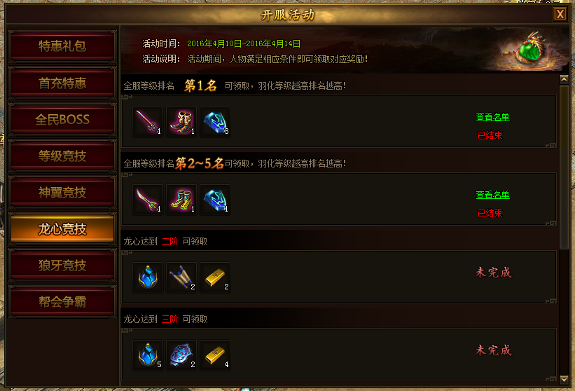 活动内容:活动期间内,玩家龙心等级排名前5的玩家可活动相应奖励;玩家龙心达到相应等级后,可领取相应奖励