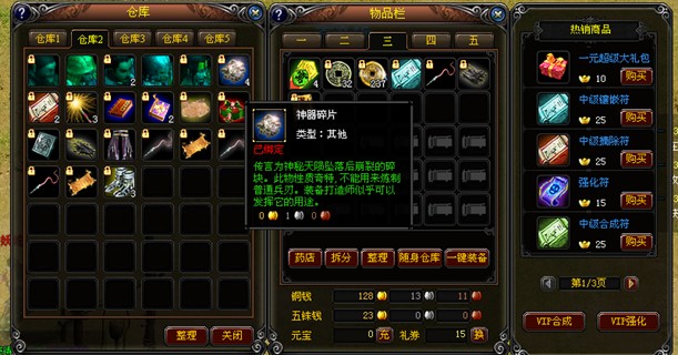挖宝的时候,玩家有一定几率获得“秘藏神器宝箱碎片”,集齐三个可以合成秘藏神器宝箱,能够直接开出60级的秘藏武器,红色品质,属性超好,职业随机的,但是不能交易,否则绝对是市场上的抢手货。