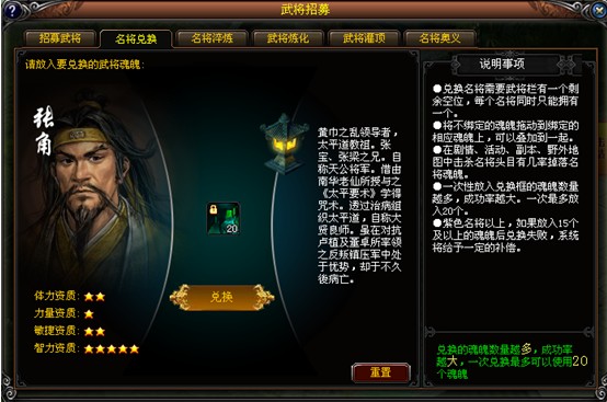 首先获取名将最直接最简单的途径就是用魂魄直接去换,兑换的时候,加入的魂魄数量越多,换得的成功率就越高,一次加入二十个基本就稳成了,最开始的周仓入手任务就是这样的。之后的许多剧情副本里面都可能会有名将魂魄的掉落,一定要好好收藏,最开始背包不够,个别勇猛玩家见数量太少,会选择丢弃---悲剧。但是虽然说一次加入二十个魂魄是稳成的,但是也有几率出现小差错,就是魂魄凝结不成,造成名将元气大伤的情况,元气大伤状态下的名将都是白名的,要一点点的培养。不过还好,有洗髓丹这种好东西,可以让我们千辛万苦得来的名将重放光彩。