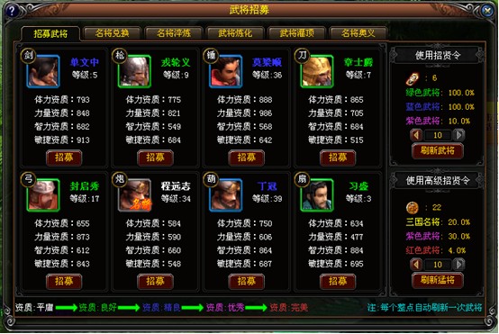 另外在战将无二中,还有一种快速获取名将的方法就是直接去招募,升级赠送的点卷如果你一直留着的话,那么到三十多级的时候,应该可以再招募官那里挥霍一下了。买点高级招贤令,一次多放几个,建议直接十个一组,如果人品好,一手就出名将,如果人品不好就不多说了。但是一般看来,两三次都能出一个名将,运气好的话还能额外招几个紫色武将,更有机会获得红色逆天武将,不比高级名将差。这是最便捷的方法了,资金充裕的话。
