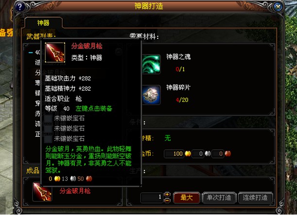 玩家在研究装备打造的时候应该会发现,最醒目的一条“神器打造”,可以打造40级逆天红色武器,需要的材料是神器之魂和神器碎片,虽然是40级的但是用神器碎片可以升级。其逆天属性绝对不是紫色装备所能比拟的。但相应的打造材料的获取也是十分艰难的,尤其是神器之魂,可遇而不可求,但是最直接的获得方式还是去右上角的“开巡”里面进行“巡查铁铺”,不但能获得神器打造与升级的材料,更有可能直接获得部分极品装备。而且个人认为,这里面的元宝消费不是太高,而且材料出现几率比较高。普通武将不用说,但是名将至少要有一身像样的装备才好,否则很难发挥出名将的威力!