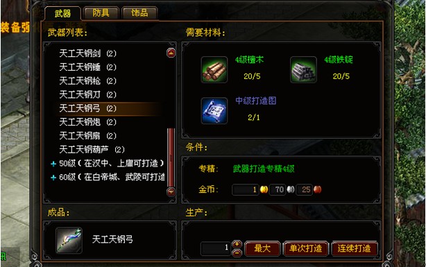 准备工作做好以后,就可以开工了。当然要在你的修为点上来以后,前期不用点的太多,跟上自己等级的提升就可以。也就是说,当你升到40级可以打造40级的装备就可以。根据实验,没把修为的最后一项点出来以后,制作十把武器就可能做出三把左右的蓝色品质装备(人品爆发出紫装),对于前期与中期的玩家来说,自己的六名武将连装备都不全,能有蓝色品质装备已经是很不错的了,战斗力也明显增强不少。