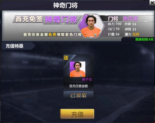 内容:活动期间,首次充值1元即可获得紫色门将“奥乔亚”。