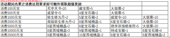 活动期间,累计消费元宝数达到活动要求即可领取奖励,可以叠加领取,如,活动期间消费1000元宝,可以领取100元宝-1000元宝档次的所有奖励