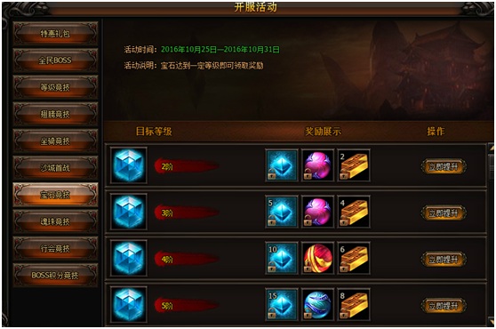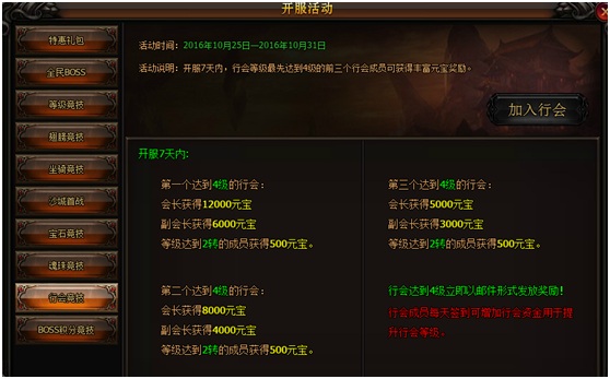 1、开服7天内,行会等级最先达到4级的前三个行会成员可获得丰富的元宝奖励