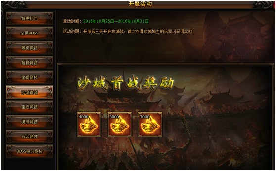 1、标签页在开服第4天开启,活动期间内,首个攻城城主可获得奖励。