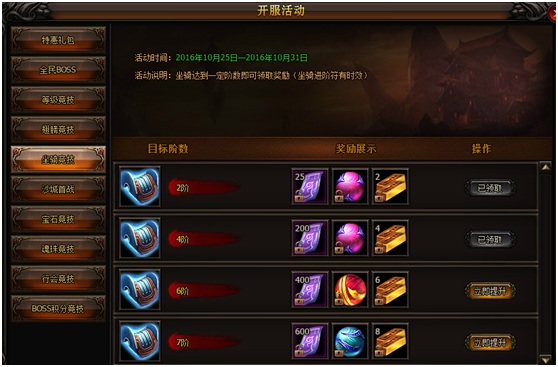 2、达到达标坐骑阶数时,可领取达标奖励。