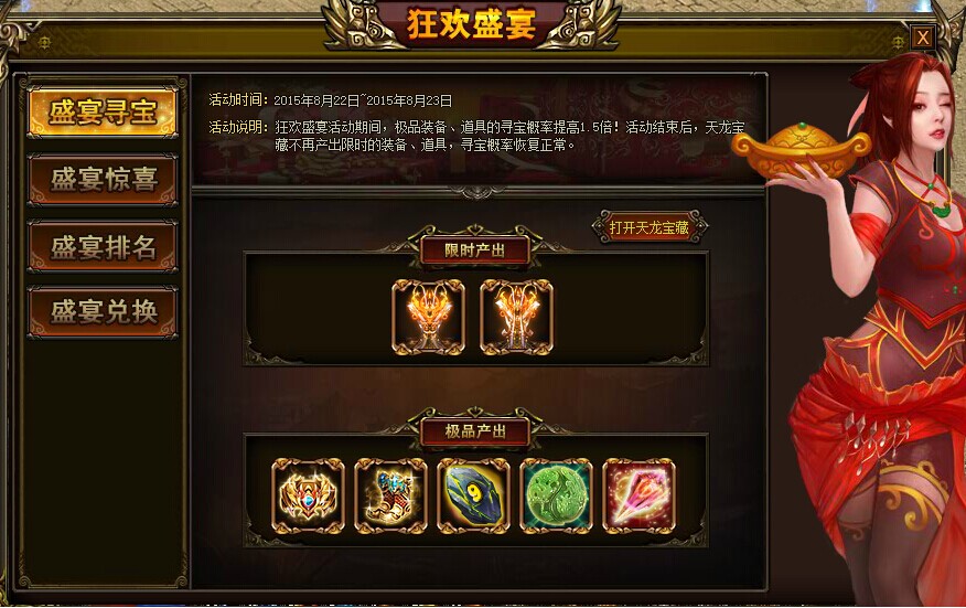 活动内容:狂欢盛宴期间,极品装备、道具的寻宝获得概率提高1.5倍!还有极品幻装—齐天大圣。活动结束后,天龙宝藏不再产出地炎魔晶和璞玉,寻宝概率恢复正常!